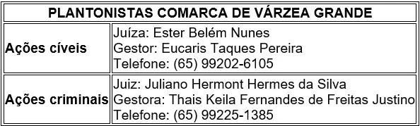 Confira quem serão os plantonistas na comarca de Várzea Grande: